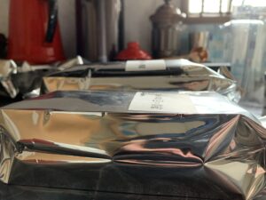 珈琲豆の袋の膨らみを比較しているところ
